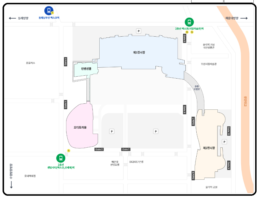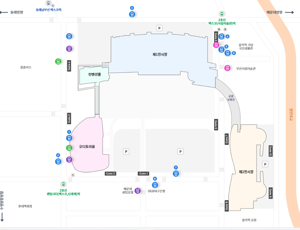 홈플러스 맞은편 횡단보도를 이용하거나 지하철 2번 출구로 진입하여 1번 출구로 나오시면 벡스코로 바로 진입가능