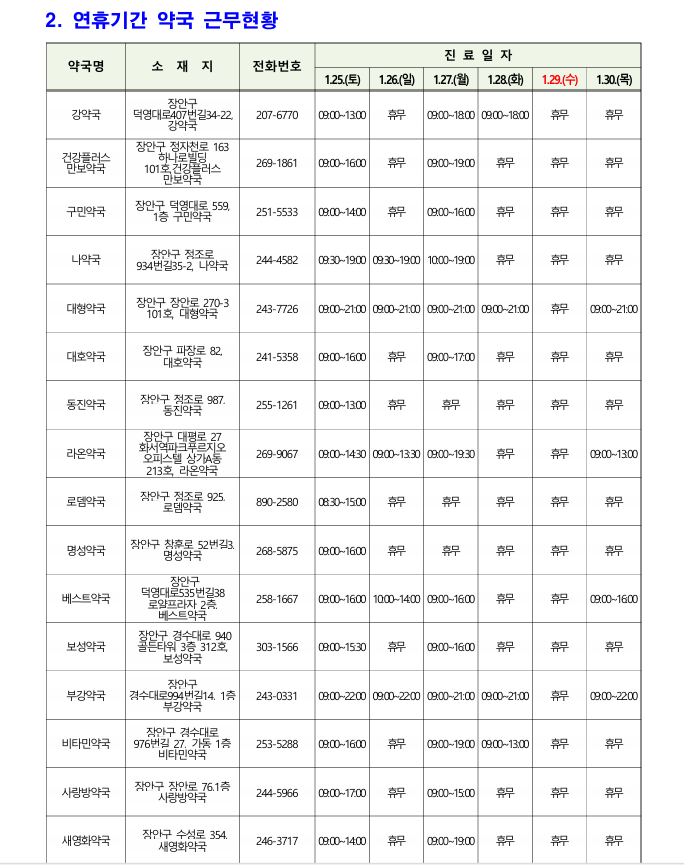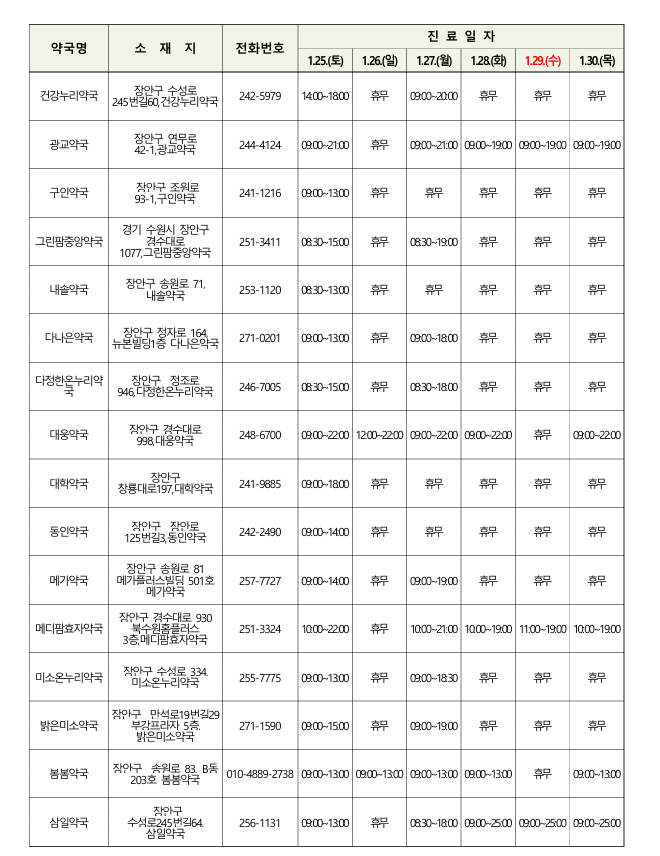 | [수원시] 연휴기간 병의원 및 약국 운영안내 (0) | 2025.01.24 |