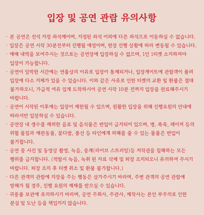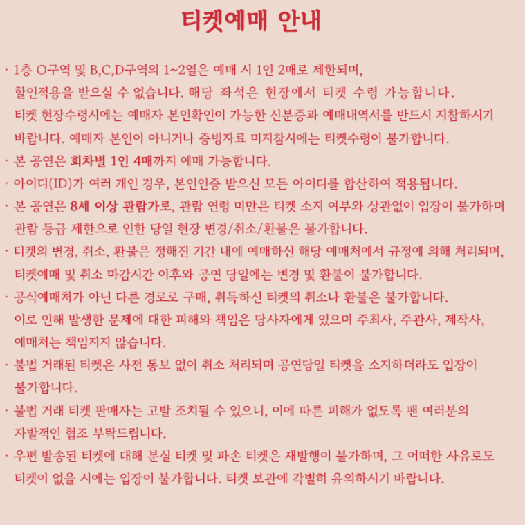 일부 좌석은 무대 연출 및 아티스트 위치에 따라 구주물, 장치, 카메라, 주변 관람객과의 신장차이 등의 이유로 일부 시야 방해가 발생할 수 있음