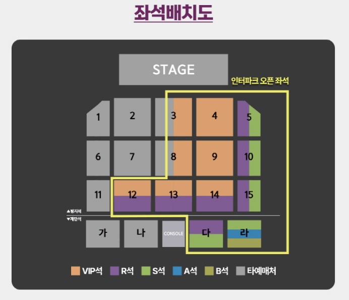 본 공연 1~14 구역은 단차가 없는 평지에 플라스틱 간이 의자가 설치된 좌석이며, A~E구역은 계단식 좌석으로 진행됩니다.