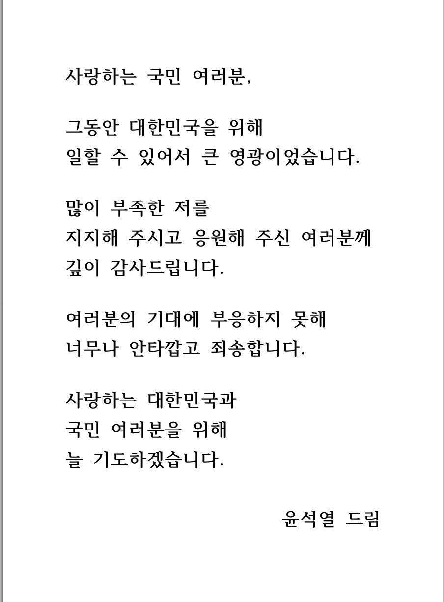 이로써 윤 전 대통령은 즉시 대통령직에서 물러났으며, 대한민국은 60일 이내 조기 대선을 실시하게 되었습니다.헌재의 결정 이후, 윤 전 대통령은 짧은 입장문을 통해 자신의 생각을 밝혔습니다.