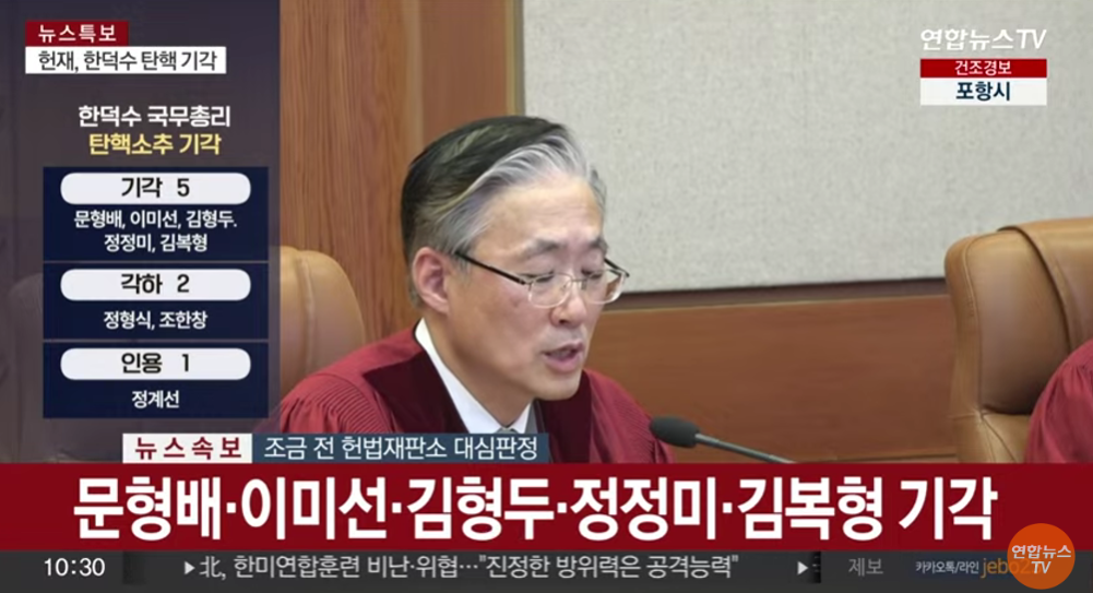2025년 3월 24일, 헌법재판소는 국무총리 한덕수에 대한 탄핵심판을 기각했습니다. 재판관 9인 중 5명(문형배, 이미선, 김형두, 정정미, 김복형)이 기각 의견을 내며, 다수의견으로 채택된 것입니다.
