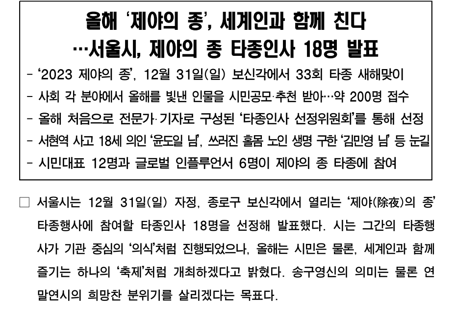 코로나19 이후 4년 만에 진행되는 타종행사에서 '제야의 종'을 울릴 타종인사 18인을 공개합니다...