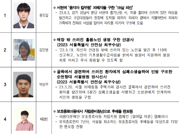 🌟우리 사회 각 분야에서 역경을 극복하며 묵묵히 맡은 바 책임을 다함으로써 귀감이 된 시민 🌟사회에 잔잔한 감동을 준 선행 시민 🌟어려운 환경 속에서도 나눔과 봉사를 실천해 온 시민 🌟사회 각 분야에서 활약하며 국민에게 희망과 용기를 물어 넣어준 시민 🌟국제무대에서 국위를 선양한 시민 등